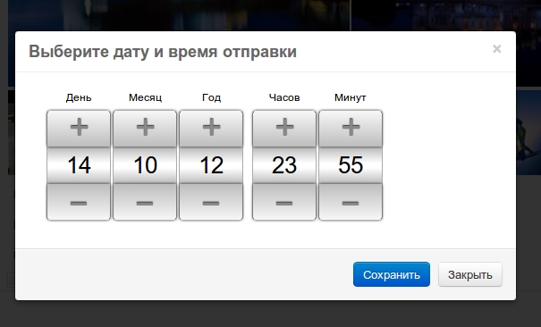 Время отправки не должно быть меньше текущего времени. Максимальное время отправки через неделю.