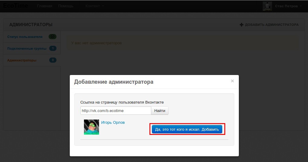 EcoTime найдет пользователя которого вы указали и если все верно, тогда нажмите кнопку "Да, это тот кого я искал. Добавить"