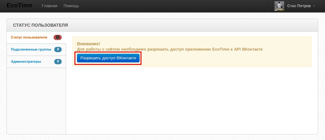 Для публикации постов необходимо подключить приложение Ecotime Вконтакте, для этого переходим на страницу Аккаунт.