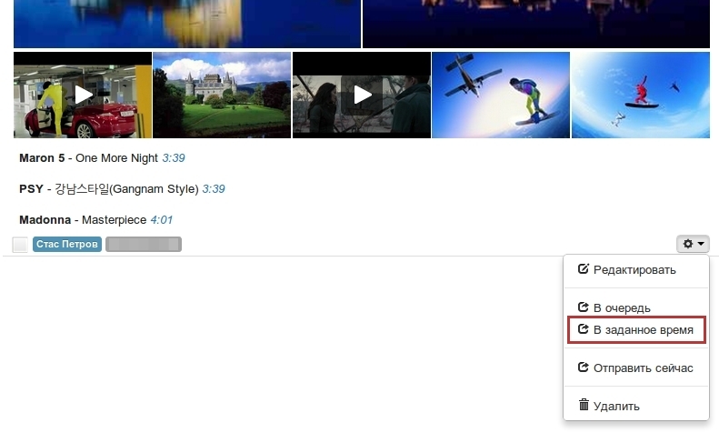 Для отправки в конкретное время выберите “в заданное время” в меню конкретного поста.