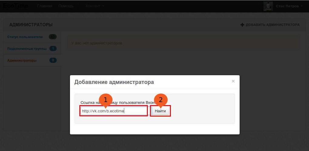 Обратите внимание, что нет необходимости добавлять в админку Вашего сообщества Вконтакте пользователя, которого Вы хотите добавить в администраторы Вашего сообщества в EcoTime. Но данный пользователь должен быть уже зарегистрированным на сайте EcoTime.