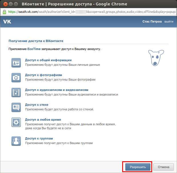 После этого в модальном окне откроется страница Вконтакте с запросом прав для Приложения EcoTime, нажимаем "Разрешить".